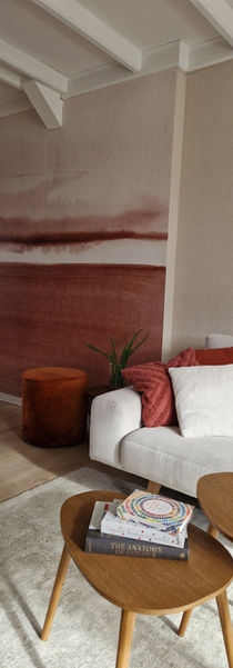 De combinatie van zandtinten, warme aardekleuren en accenten in het groen zorgen voor een warme, natuurlijke sfeer waarin de kunst een persoonlijk accent vormt .